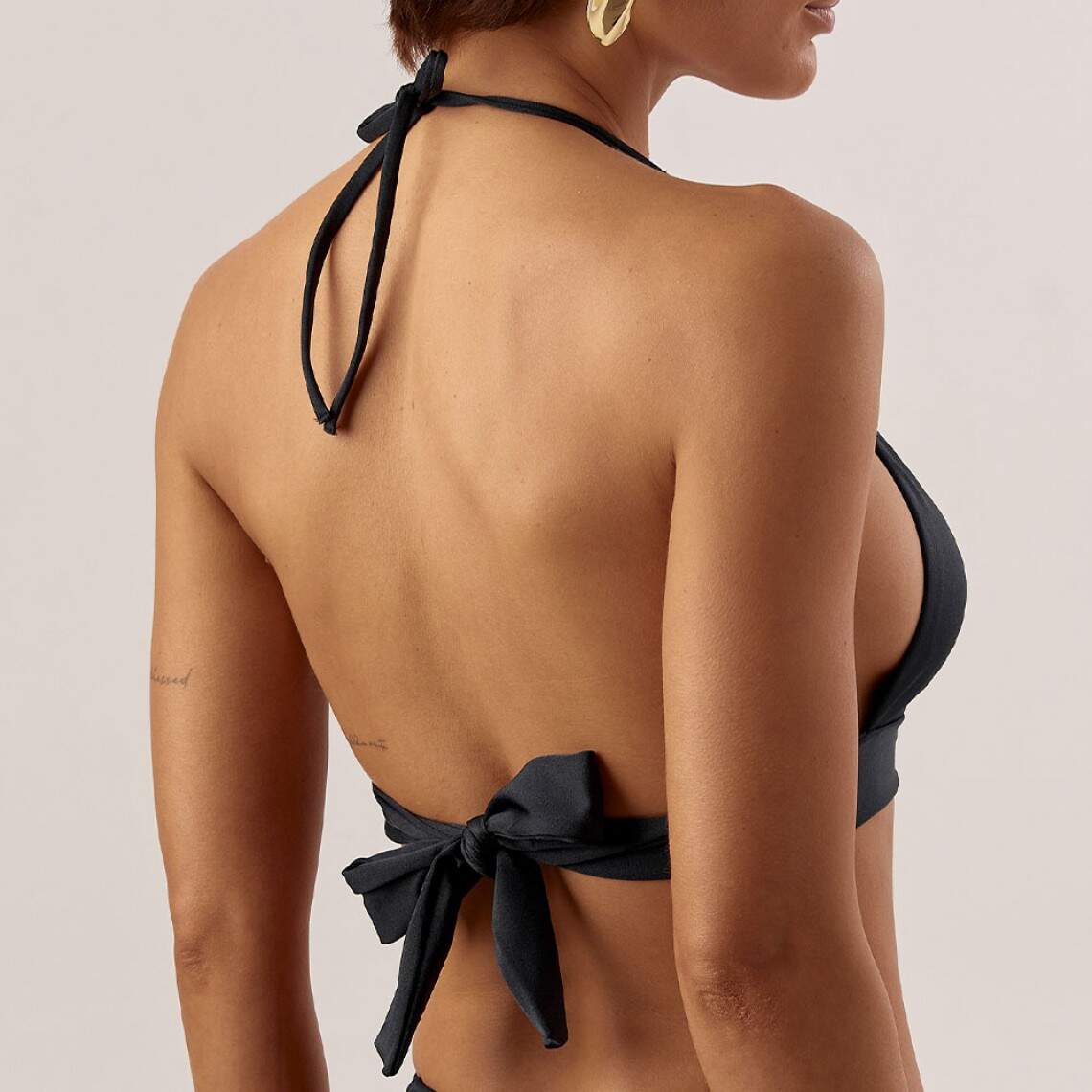 A classic triangle top complemented by luxurious decor. Thanks to the absence of rigid elements and the striking embellishment, this top provides a sense of lightness and allure. The soft anatomical shape of the cups ensures the most natural fit. The lack of underwiring guarantees complete freedom of movement and comfort throughout the day. Inside, there are special pockets with removable inserts. They help give the breasts a beautiful rounded shape and, if necessary, add light volume. Fixed straps provide stable support and confidence, ensuring they won't come untied during active leisure. The central accent of the model is a snake. This element adds character and luxury to the swimsuit. The decoration is made of a hypoallergenic alloy. It does not tarnish from salt water or chlorine, does not overheat in the sun, and remains smooth without irritating the skin. Composition: 80% polyamid