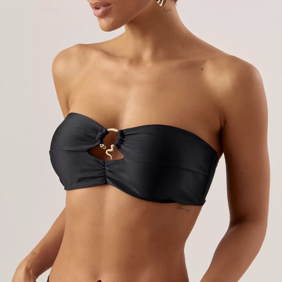 The bandeau is a fusion of minimalist design. It is created to make you feel confident whether lounging on a sunbed or during active swimming. The horizontal cut of the cups allows for maximum exposure of the shoulder line and décolletage, while the snake-shaped embellishment transforms the swimsuit into a true piece of art. This is a classic style that never goes out of fashion and ensures an even tan. The inner edges of the bust feature silicone lining along the entire perimeter. This creates a secure grip against the skin, ensuring the top does not slip and maintains its shape even without straps. The cups are equipped with soft inserts that help model a beautiful breast shape and add light volume. If desired, they can be easily removed for a more natural look or faster fabric drying. The decoration does not cause skin irritation even with prolonged contact. Designed specifically for