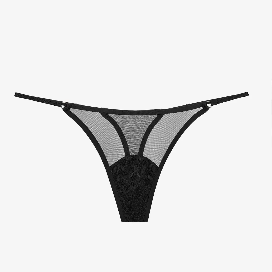 Ці стрінги з низькою посадкою — ідеальний вибір для тих, хто цінує ніжність та чуттєвість. Виготовлені з чорної сітки, вони делікатно прикрашені мереживом у зоні ластовиці, що додає образу витонченості. Тонкий регульований пояс забезпечує комфортну посадку, а бавовняна ластовиця гарантує відчуття свіжості. Склад: поліамід 69%, еластан 16%, віскоза 6%, поліестер 1%, бавовна 8%