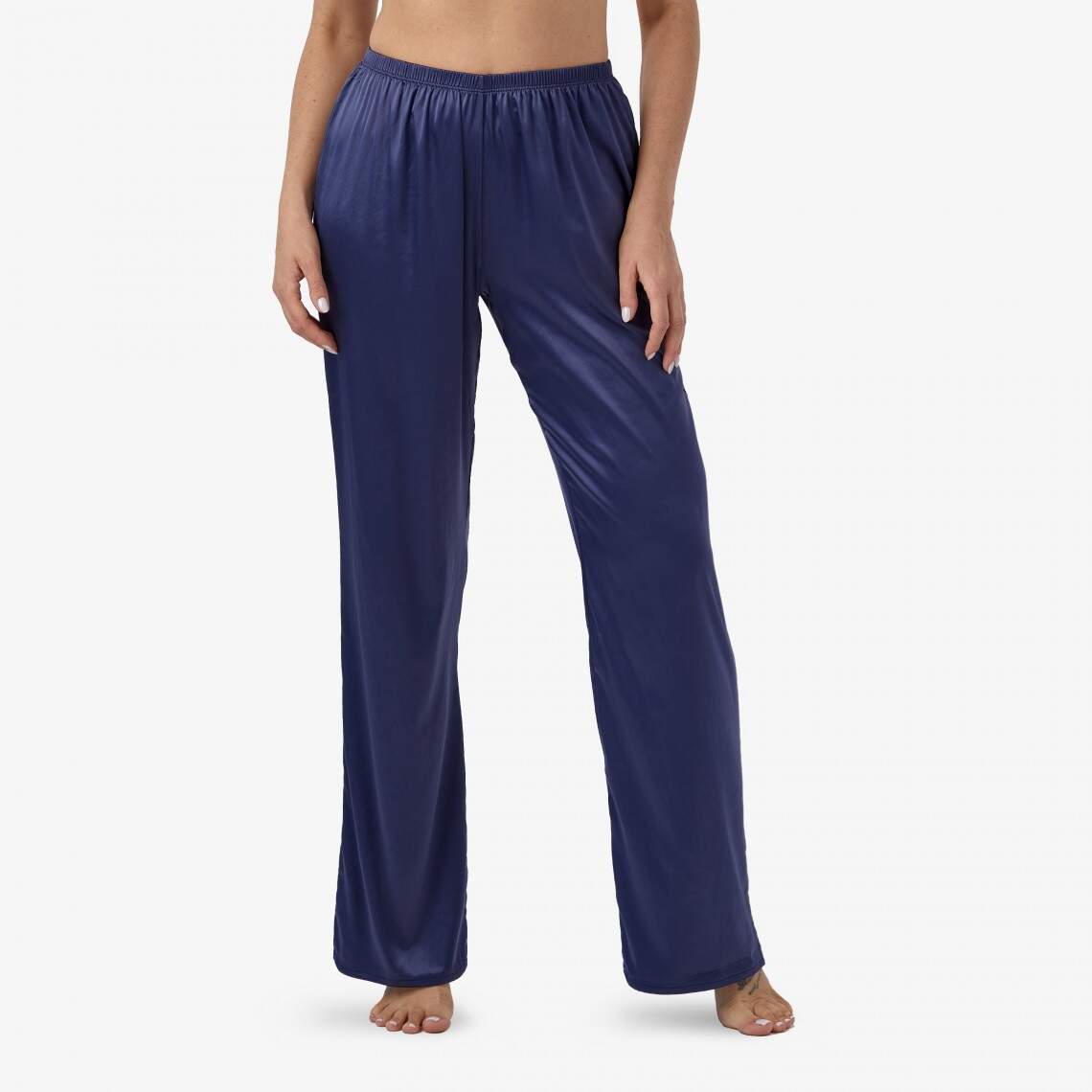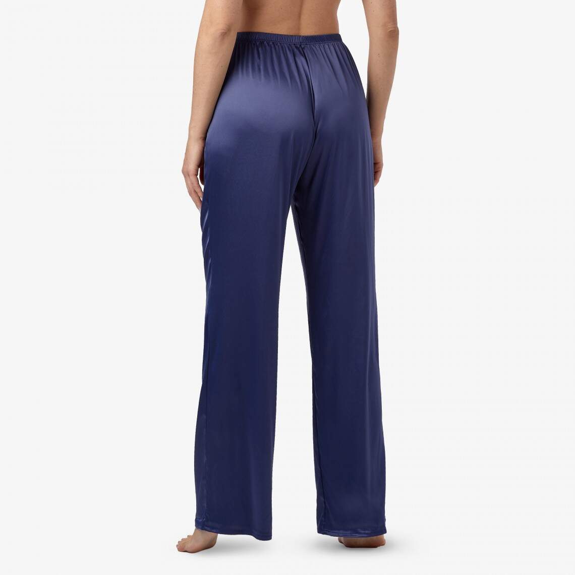 Штани прямого крою, що поєднують в собі бездоганний стиль та максимальний комфорт. Виконані з гладкого, як шовк, атласу глибокого кольору індиго, вони дарують відчуття розкоші з кожним рухом. М'яка резинка на талії забезпечує ідеальну посадку, а довжина максі створює витончений та граціозний силует. Створіть цілісний домашній образ, поєднуючи їх з кімоно та білизною з цієї ж лінії. Склад: Поліестер 92%, еластан 8%
