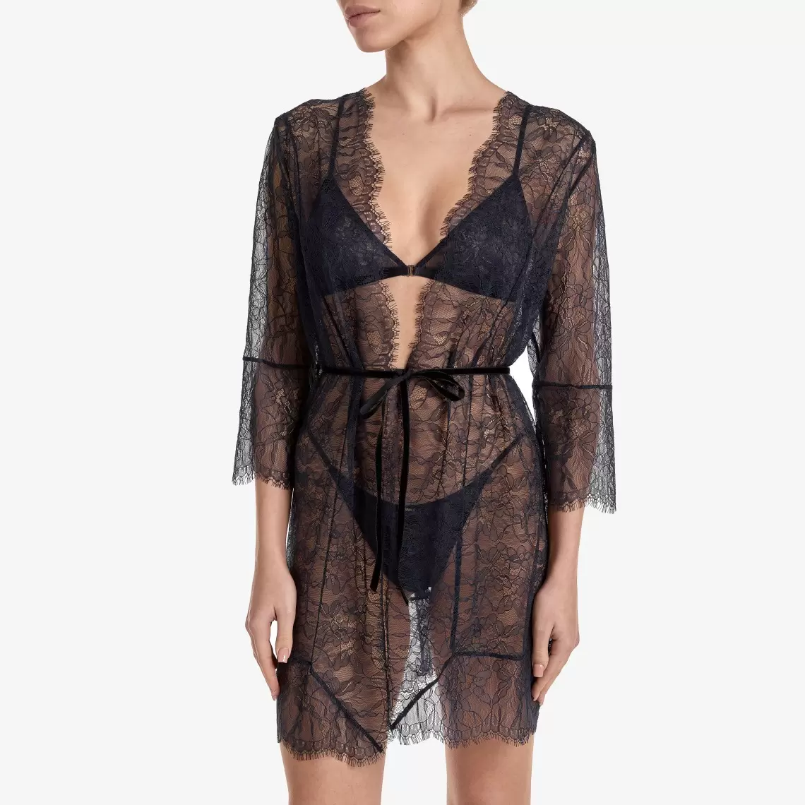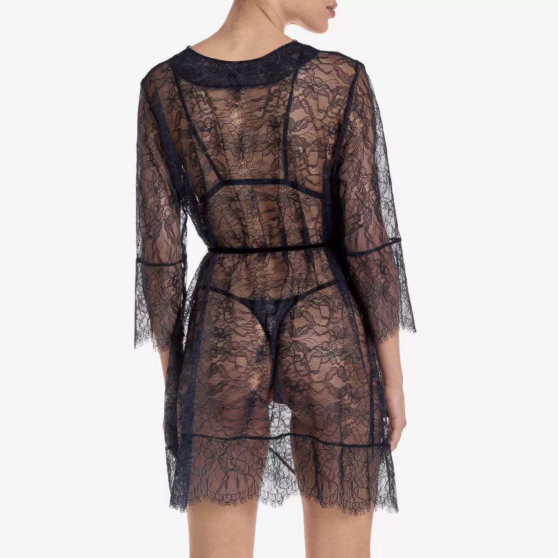 Wrap yourself in softness and lightness. This delicate robe of dark blue lace is the perfect choice for creating a sophisticated loungewear look. The mini length and loose fit make it incredibly comfortable, while an elegant tie belt allows you to accentuate the waist. This model is a true embodiment of romance. Composition: Polyamide 72%, Elastane 18%, Viscose 8%, Polyester 2%
