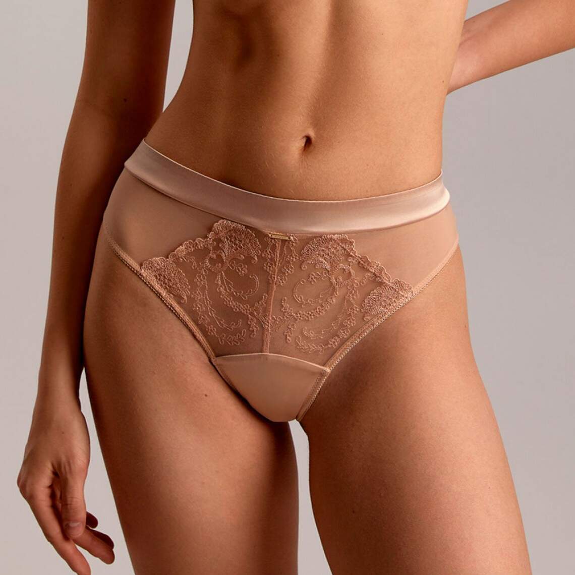 Секрет бездоганного образу починається там, де закінчується компроміс між комфортом і красою. Ці сліпи з високою посадкою створені, щоб дарувати вам відчуття власної винятковості. Поєднання золотистого атласу, прозорої сітки та витончених вирізів, що подовжують ніжки, формує величний та водночас спокусливий силует. Деталь, яка перетворює щоденний ритуал одягання на акт любові до себе. Склад: 69% поліамід, 16% еластан, 6% віскоза, 1% поліестер, 8% бавовна.
